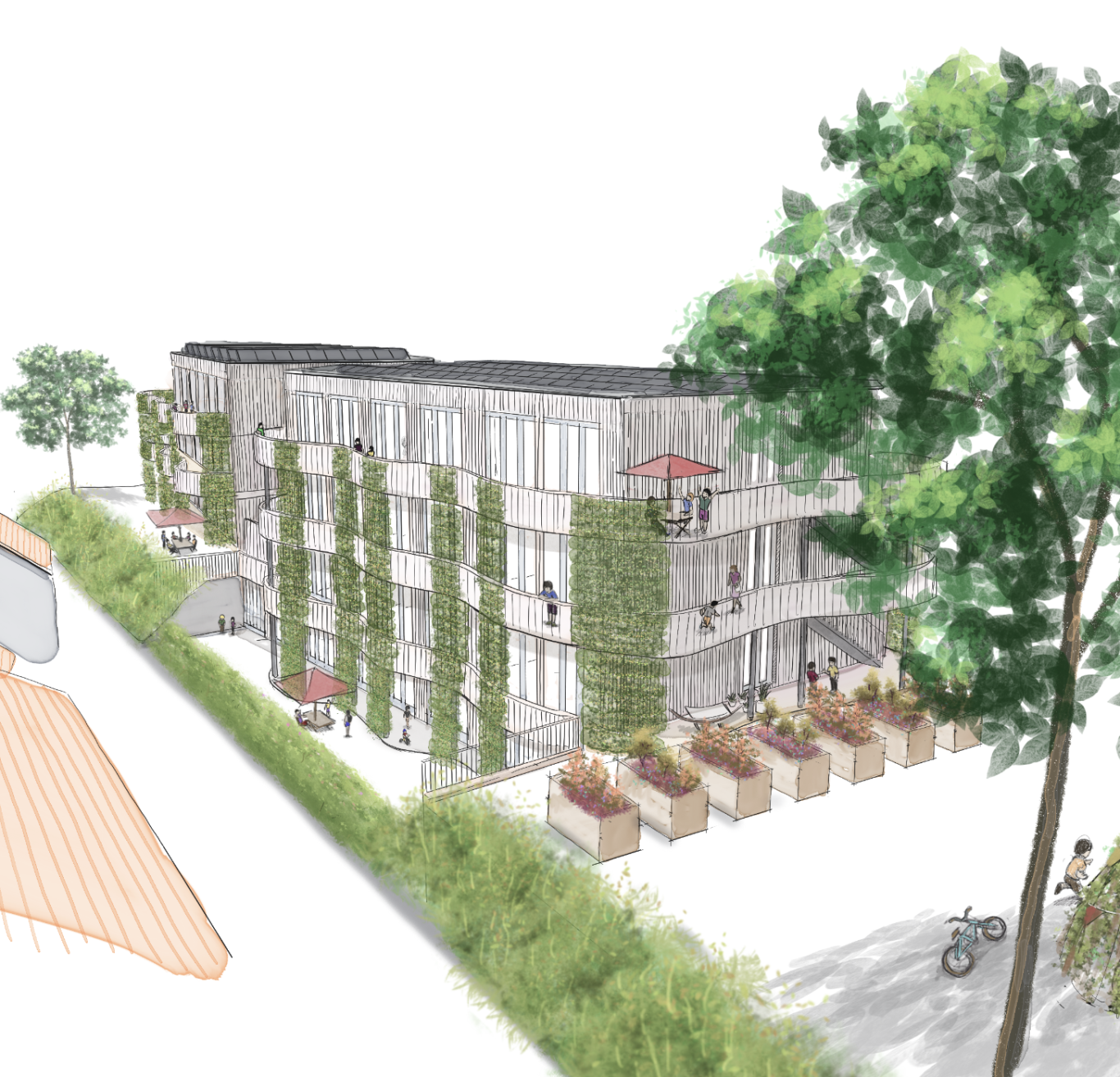 Die Leitidee hat das Ziel, das Grundstück effizient zu beplanen und Flächenpotentiale maximal auszuschöpfen, eine hohe Außenraumqualität mit differenzierten Angeboten und gute Belichtung der Wohnungen zu gewährleisten.